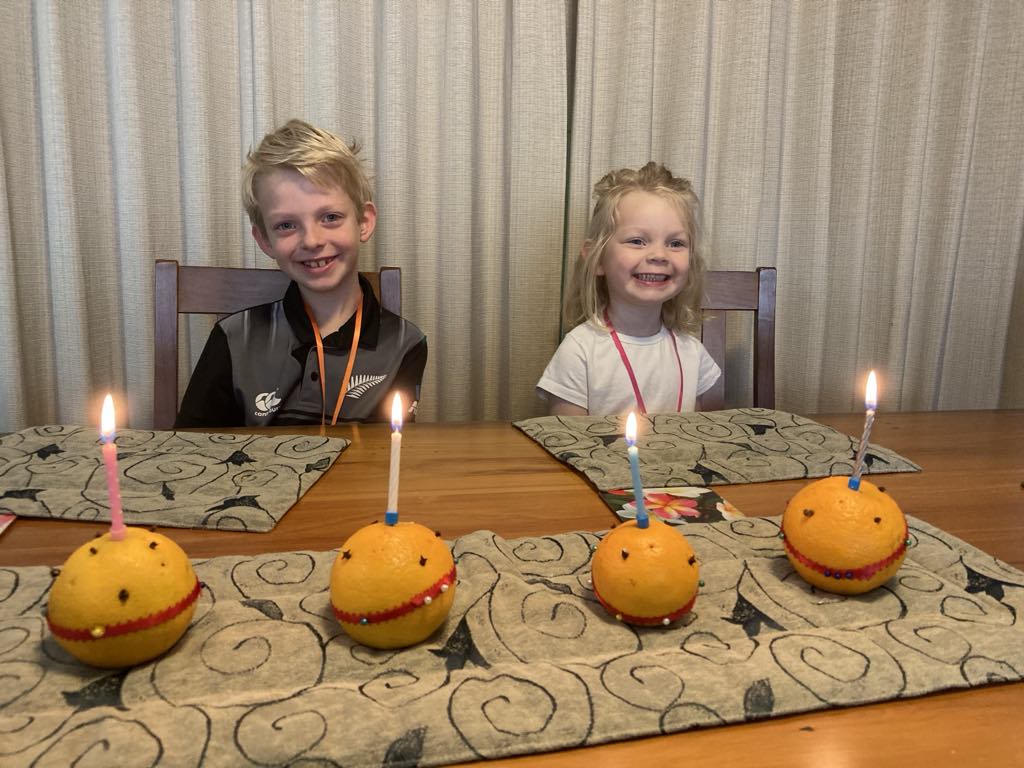 Photo of visiting grandchildren with their Christingles (minus the consumed goodies on toothpicks!).